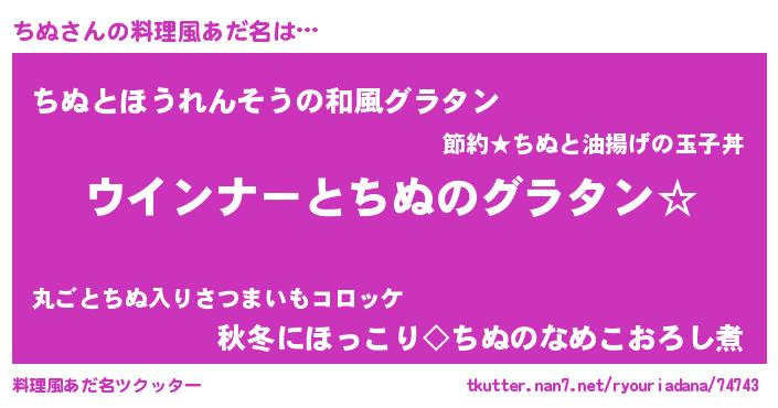 | 女子向けラノベタイトル風あだ名 | 『ちぬ伯爵の花嫁』『ちぬの玉の輿計画!』 |
