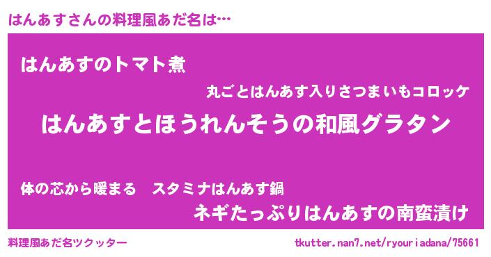 | 男性向けラノベタイトル風あだ名 | 『はんあす~年齢イコール彼女いない歴の魔法使い~』 |
