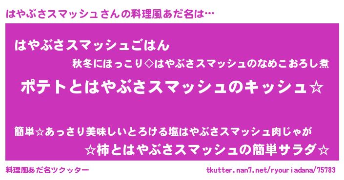 | 男性向けラノベタイトル風あだ名 | 『はやぶさスマッシュの嫁は女の子じゃないと思った?』 |