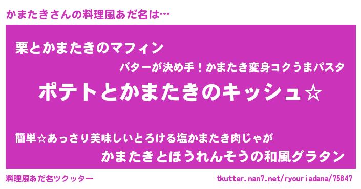 | 女子向けラノベタイトル風あだ名 | 『かまたきの卵を拾いまして』 |