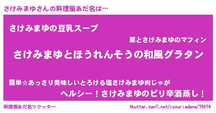 | 男性向けラノベタイトル風あだ名 | 『さけみまゆ~年齢イコール彼女いない歴の魔法使い~』 |