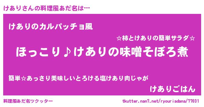 | 男性向けラノベタイトル風あだ名 | 『けありの憂鬱』『魔弾の王とけあり』 |