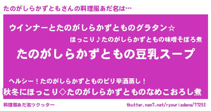 | 意味不明あだ名 | 『とにかく怪しいたのがしらかずとも』 |