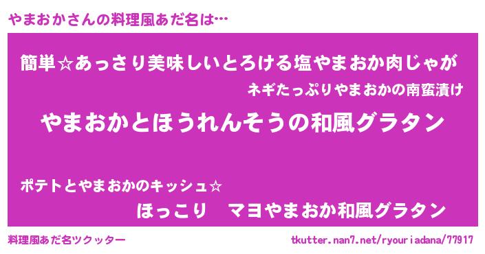 | 男性向けラノベタイトル風あだ名 | 『やまおか~年齢イコール彼女いない歴の魔法使い~』 |