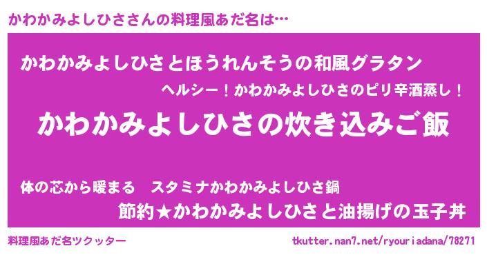 | 胡散臭い通販商品みたいなあだ名 | 『億万長者になれる霊験あらたかなお札…その名も「かわかみよしひさ」』 |