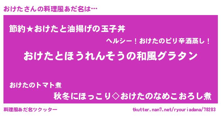 | 女子向けラノベタイトル風あだ名 | 『おけたの玉の輿計画!』 |