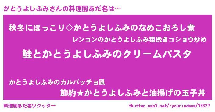 | ヘコむあだ名 | 『かとにゅー』『かとうよしふみ(爆)』 |