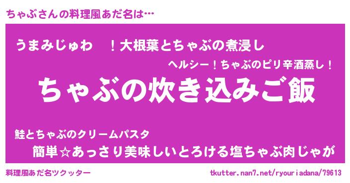 | 男性向けラノベタイトル風あだ名 | 『冴えないちゃぶの育てかた』 |