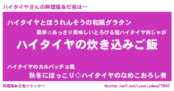 | 男性向けラノベタイトル風あだ名 | 『うちのハイタイヤが世界を掌握している!』 |