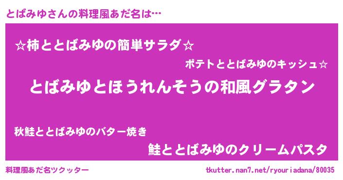 | ヘコむあだ名 | 『とばぷりん』『とばみゆ(苦笑)』 |