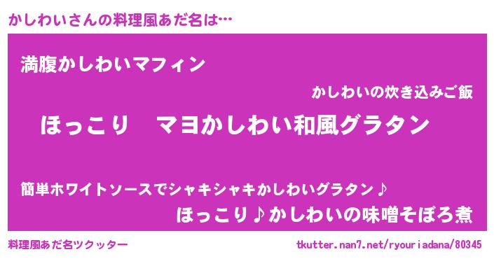 | 男性向けラノベタイトル風あだ名 | 『この素晴らしい世界にかしわいを!』 |