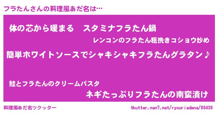 | 男性向けラノベタイトル風あだ名 | 『フラたんの嫁は女の子じゃないと思った?』 |
