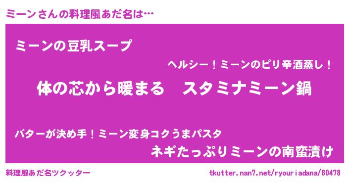 | 女子向けラノベタイトル風あだ名 | 『ミーンの雑貨屋さん』『ミーン恋絵巻』 |