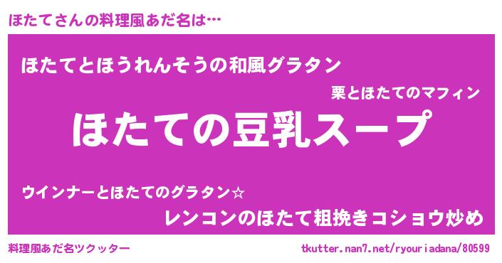 | 意味不明あだ名 | 『とにかく怪しいほたて』『自称ほたて』 |