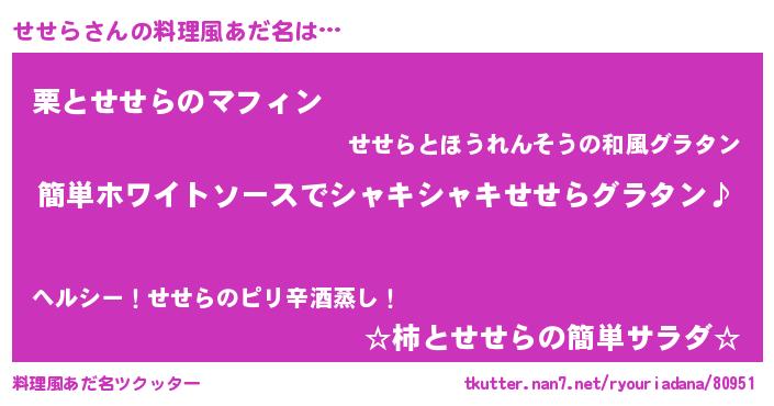 | 意味不明あだ名 | 『とにかく怪しいせせら』『自称せせら』 |