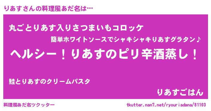 | ヘコむあだ名 | 『りあを』『りあす(震え声)』『牛乳』 |