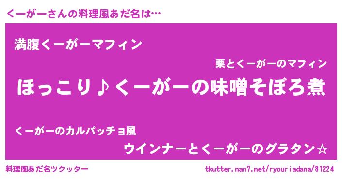 | 男性向けラノベタイトル風あだ名 | 『くーがーの憂鬱』『魔弾の王とくーがー』 |