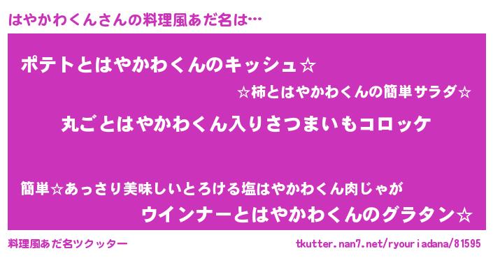 | 女子向けラノベタイトル風あだ名 | 『乙女ゲームの破滅フラグしかない悪役はやかわくんに転生してしまった…』 |