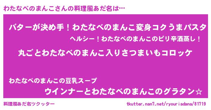 女子向けラノベタイトル風あだ名 | 『乙女ゲームの破滅フラグしかない悪役わたなべのまんこに転生してしまった…』 |