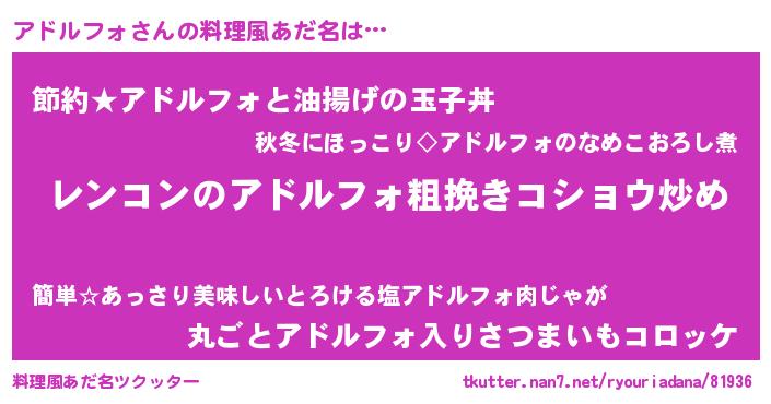 | 胡散臭い通販商品みたいなあだ名 | 『ガンによく効く高麗人参…その名も「アドルフォ」』 |
