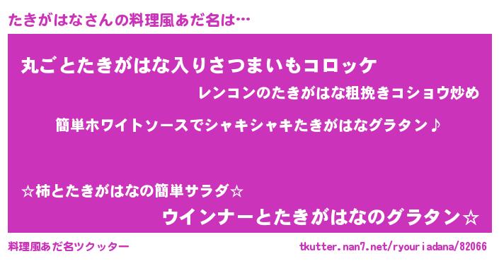 | 男性向けラノベタイトル風あだ名 | 『たきがはなの嫁は女の子じゃないと思った?』 |