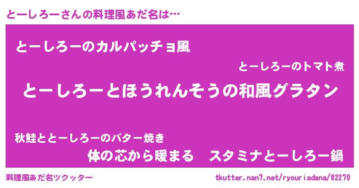 | 胡散臭い通販商品みたいなあだ名 | 『あなたにだけ特別に提供する100年もののヴィンテージワイン…その名も「とーしろー」』 |
