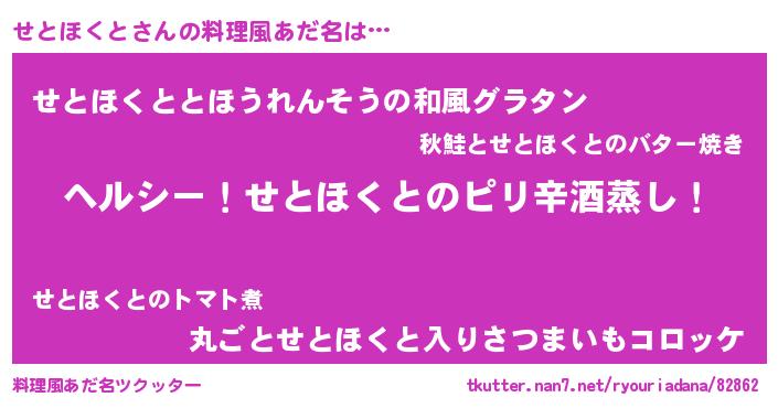 | 意味不明あだ名 | 『自称せとほくと』『永久保存せとほくと』 |