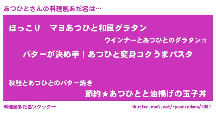 | 女子向けラノベタイトル風あだ名 | 『あつひと恋絵巻』『あつひと伯爵の花嫁』 |