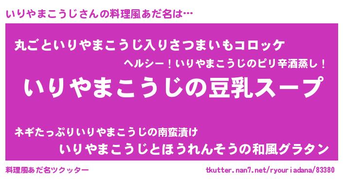 | 胡散臭い通販商品みたいなあだ名 | 『信頼と実績のサプリメント…その名も「いりやまこうじ」』 |