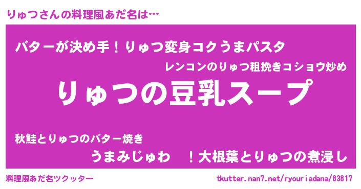 | 胡散臭い通販商品みたいなあだ名 | 『信頼と実績のサプリメント…その名も「りゅつ」』 |