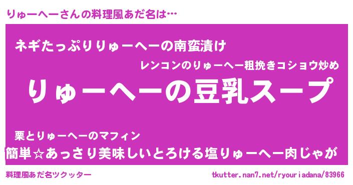| 胡散臭い通販商品みたいなあだ名 | 『信頼と実績のサプリメント…その名も「りゅーへー」』 |