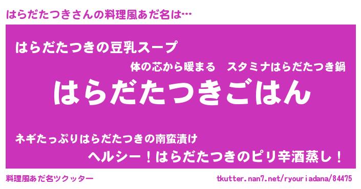 | 胡散臭い通販商品みたいなあだ名 | 『信頼と実績のサプリメント…その名も「はらだたつき」』 |