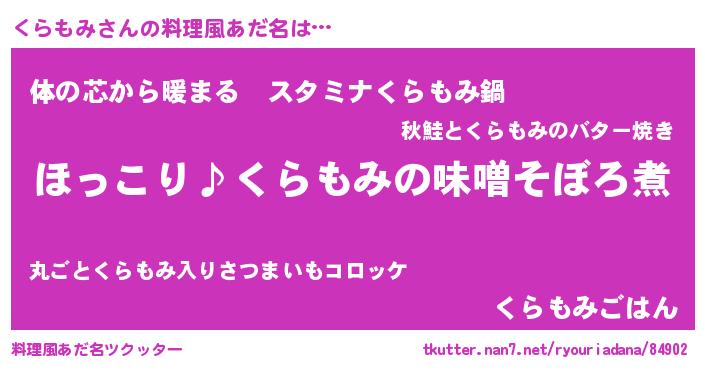 | 男性向けラノベタイトル風あだ名 | 『くらもみの憂鬱』『クラモミスレイヤー』 |