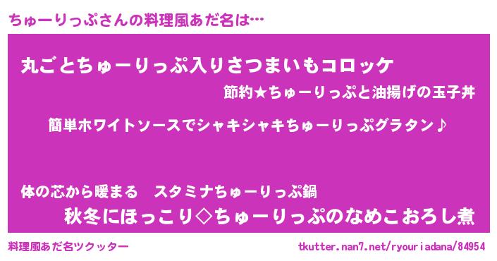 | 男性向けラノベタイトル風あだ名 | 『ちゅーりっぷの嫁は女の子じゃないと思った?』 |
