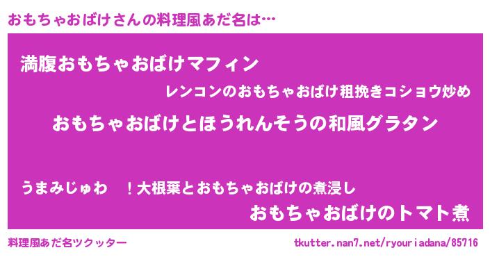 | 男性向けラノベタイトル風あだ名 | 『おもちゃおばけ~年齢イコール彼女いない歴の魔法使い~』 |