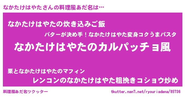 | 女子向けラノベタイトル風あだ名 | 『なかたけはやたが死なない童話 林檎のなかたけはやたの診療簿』 |