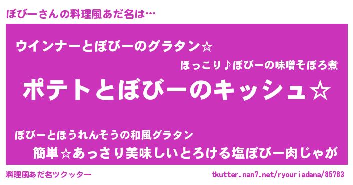 | 女子向けラノベタイトル風あだ名 | 『ぼびーの卵を拾いまして』 |