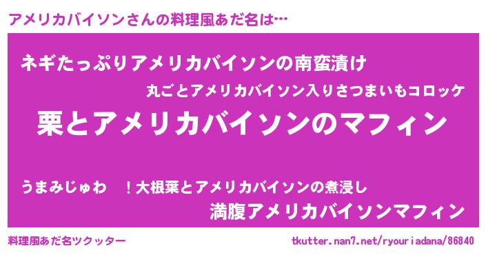 | 男性向けラノベタイトル風あだ名 | 『はたらくアメリカバイソンさま!』 |