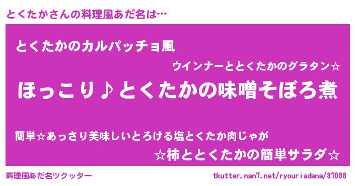 | 男性向けラノベタイトル風あだ名 | 『とくたかの憂鬱』『魔弾の王ととくたか』 |