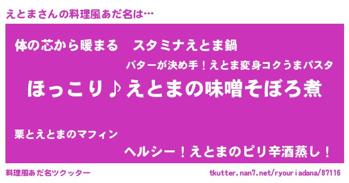 | 男性向けラノベタイトル風あだ名 | 『えとまの憂鬱』『はたらくえとまさま!』 |
