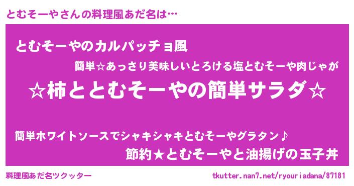| ヘコむあだ名 | 『とむっふぃ~』『とむそーや(爆)』 |