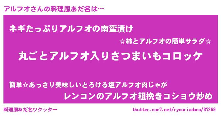 | 意味不明あだ名 | 『住所不定無職アルフオ(71歳)』 |