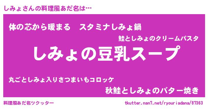 | 胡散臭い通販商品みたいなあだ名 | 『信頼と実績のサプリメント…その名も「しみょ」』 |