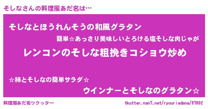 | ヘコむあだ名 | 『豆乳』『そしな(笑)』『そしにゅー』 |