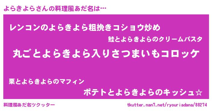 | 女子向けラノベタイトル風あだ名 | 『乙女ゲームの破滅フラグしかない悪役よらきよらに転生してしまった…』 |