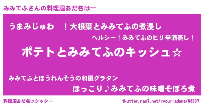 | 女子向けラノベタイトル風あだ名 | 『みみてふの卵を拾いまして』 |