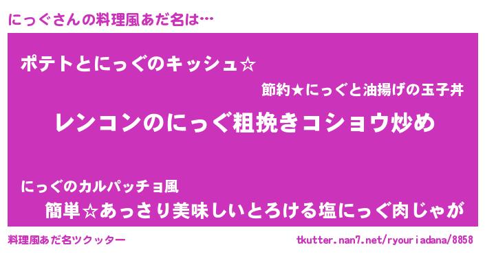 | 胡散臭い通販商品みたいなあだ名 | 『ガンによく効く高麗人参…その名も「にっぐ」』 |
