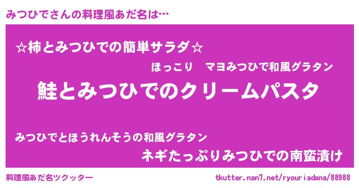 | 女子向けラノベタイトル風あだ名 | 『死神みつひでの再婚』 |