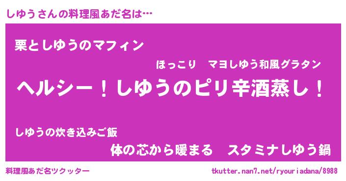 | ヘコむあだ名 | 『なまこ酢』『しゆう(笑)』 |