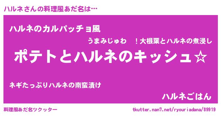 | 男性向けラノベタイトル風あだ名 | 『ハルネの嫁は女の子じゃないと思った?』 |